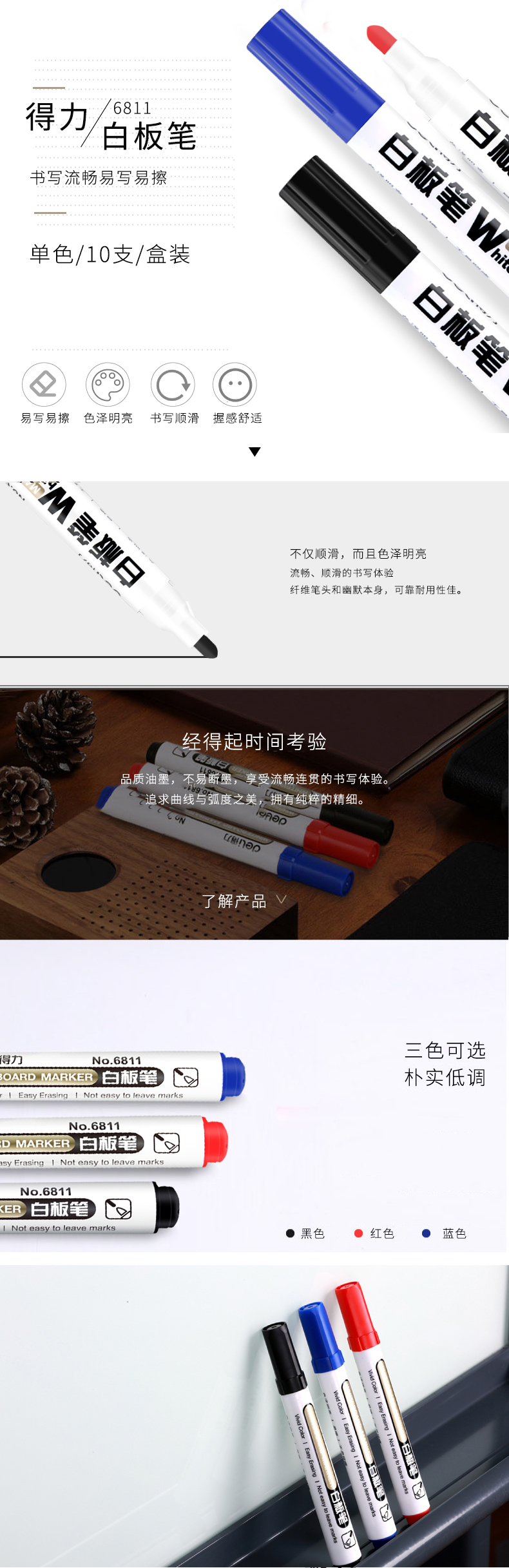 商品名称:得力(deli)办公会议教学可擦易擦白板笔 黑色 10支/盒6801