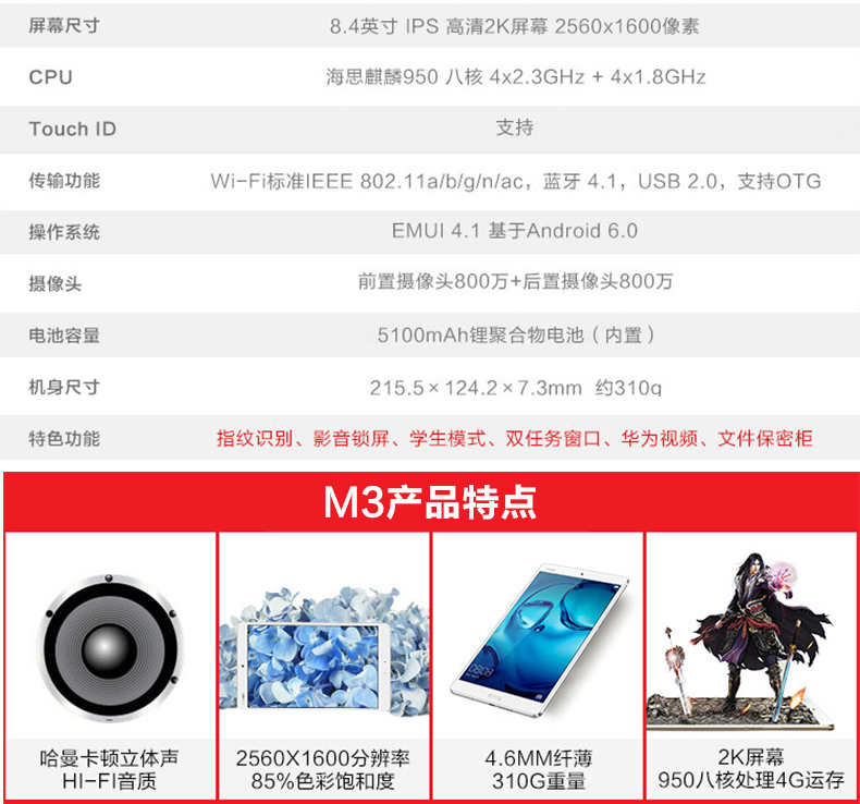 商品名称:华为(HUAWEI)M3 8.0英寸 平板电脑(不包邮) 日辉金
