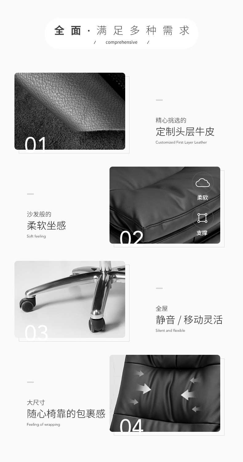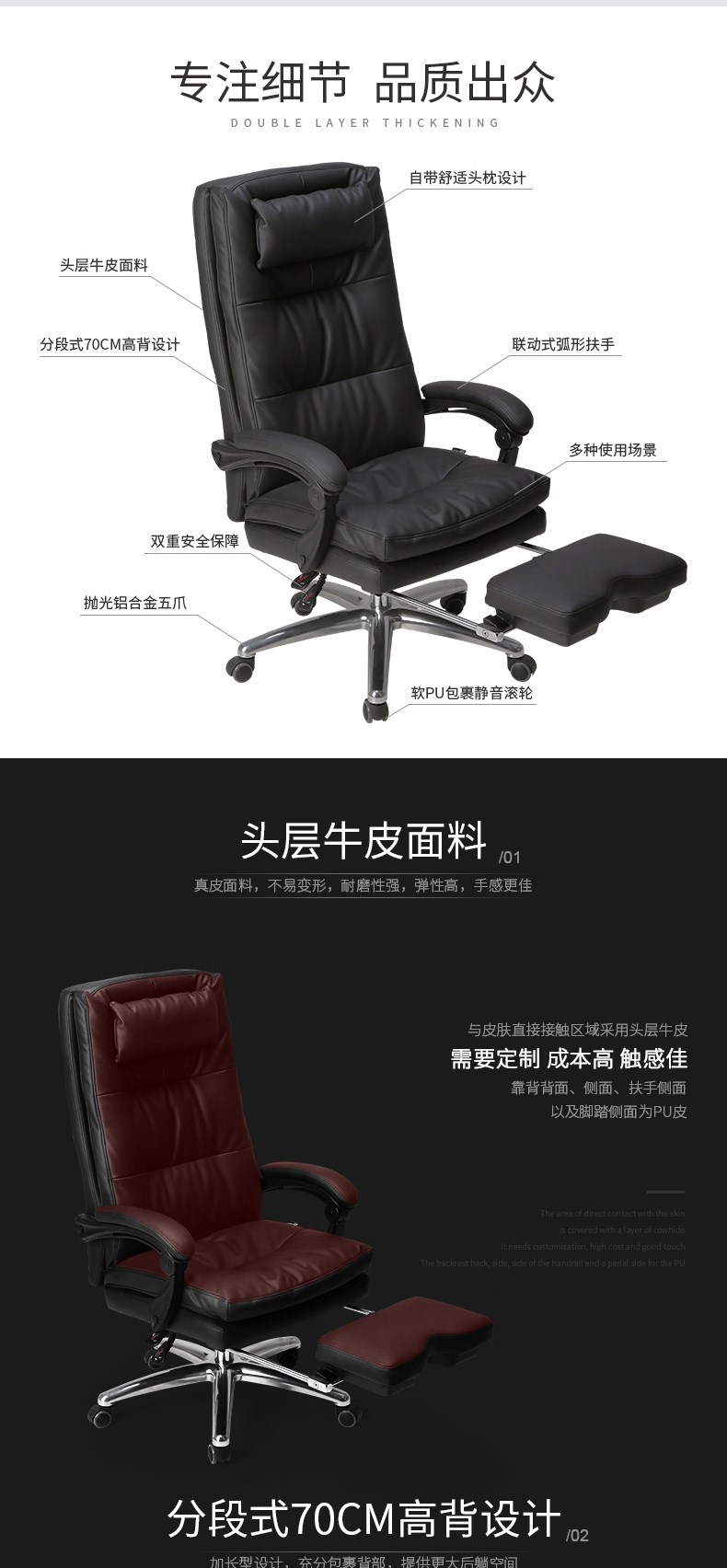 黑白调(Hbada)电脑椅 老板椅真皮 办公椅家用人体工学椅子可躺