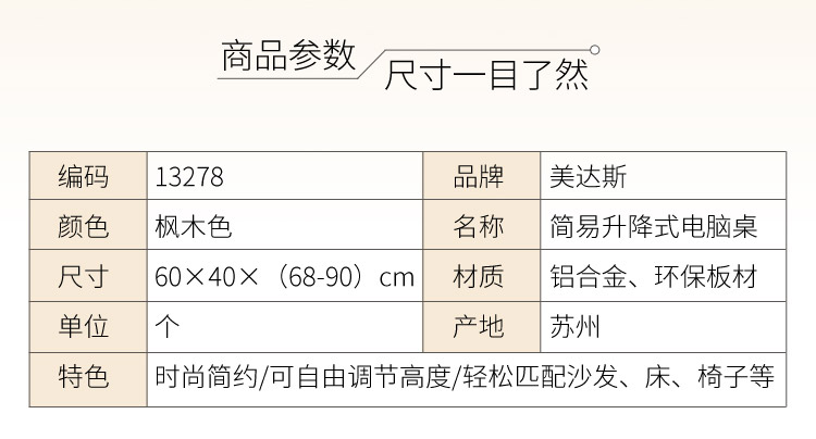商品名称:美达斯 电脑桌 简易升降式电脑桌子 边几台式笔记本办公桌枫木色