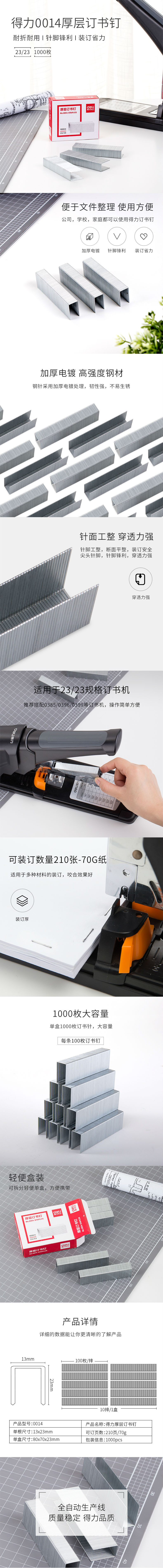 商品名称:得力0014厚层订书钉23/23厚层加厚大号订书钉 可装订210页