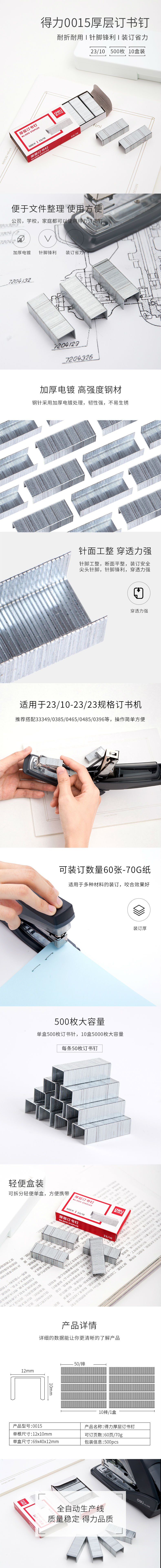 商品名称:得力0015厚层订书钉23/10穿透力好加厚适用重型订书钉