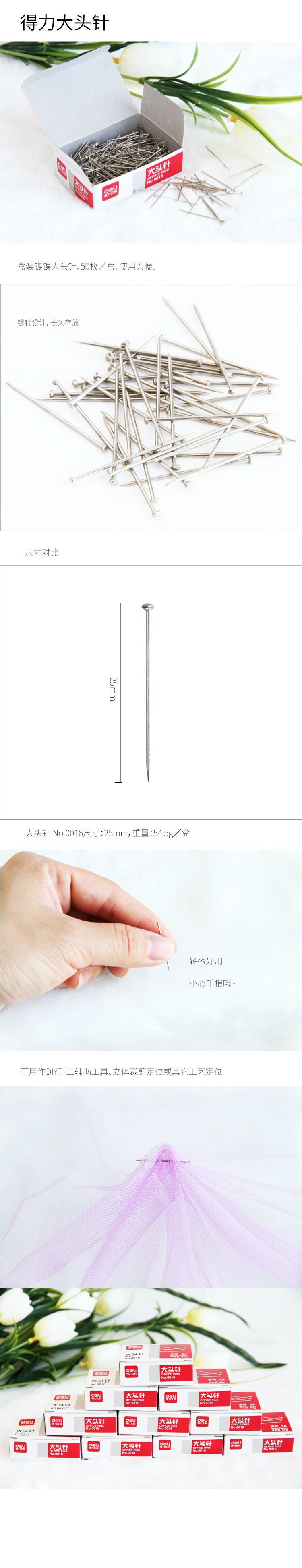 商品名称:得力0016大头针25mm2号办公用品固定大头钉定型手工配件小号