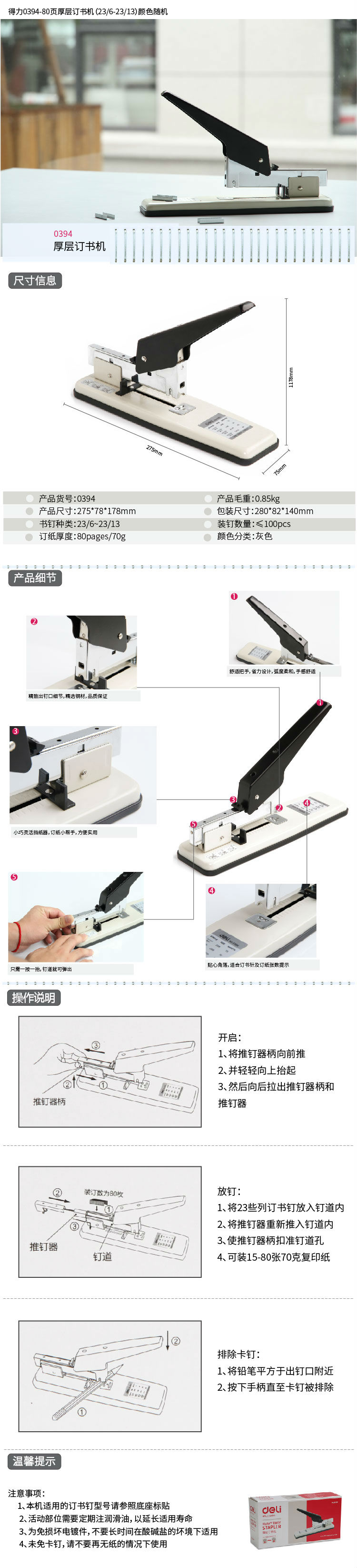 商品名称:得力0394厚层装订机大号书钉大型中号订书装订器可订80页