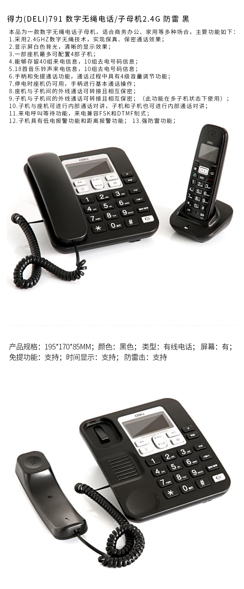 商品名称:得力791无绳电话机2.4G高通话效果座机 商务办公使用