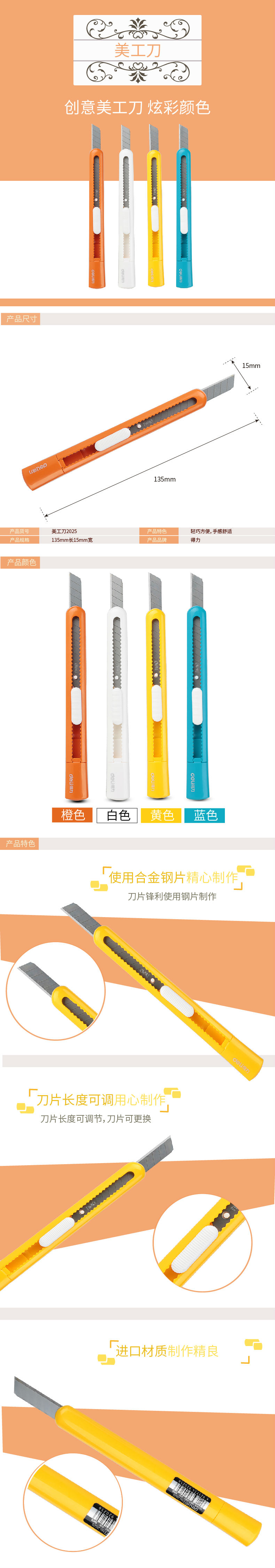 商品名称:得力2025小号美工刀加刀片可爱糖果色裁纸刀切纸刀学生手工裁刀