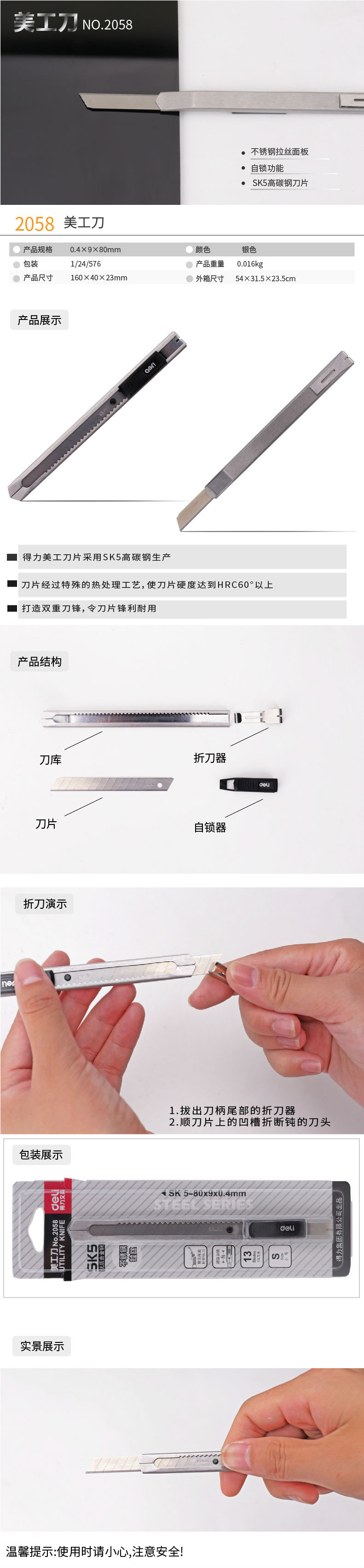 商品名称:得力2058不锈钢美工刀金属小号雕刻刀裁纸刀手工碳钢壁纸刀