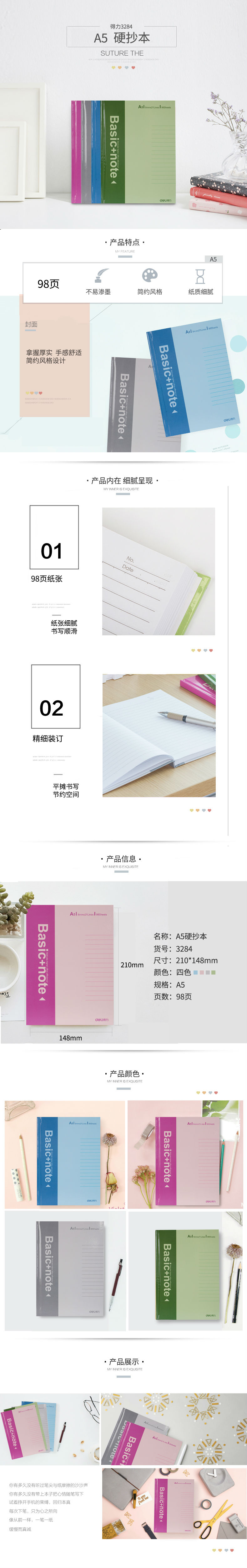 商品名称:得力文具3284硬面抄笔记本98页A5硬抄本硬书壳笔记本