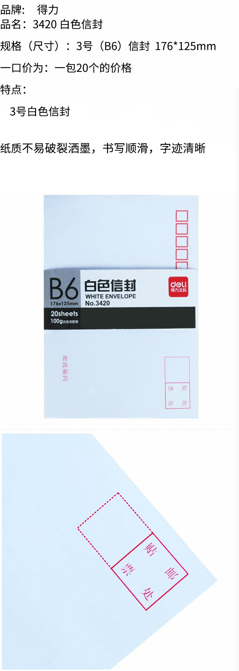 商品名称:得力信封牛皮纸白色邮局黄白色信封印刷双胶3号(个)