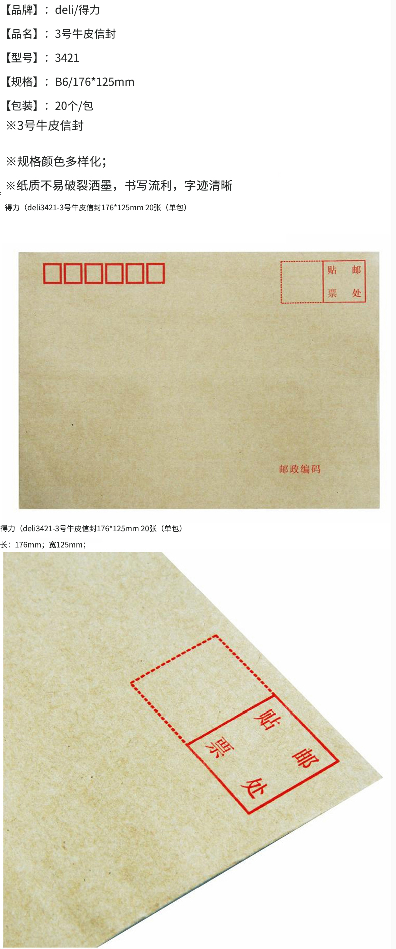 得力信封牛皮纸白色邮局黄白色信封印刷双胶3号(个)