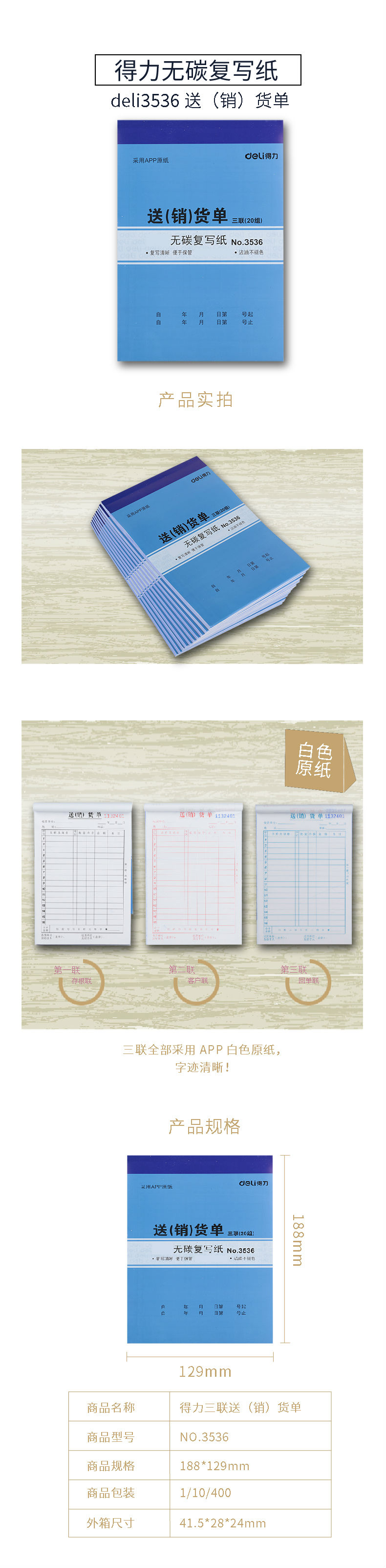 商品名称:得力3536二联三联送货单销货清单无碳复写纸销货单据本仓库