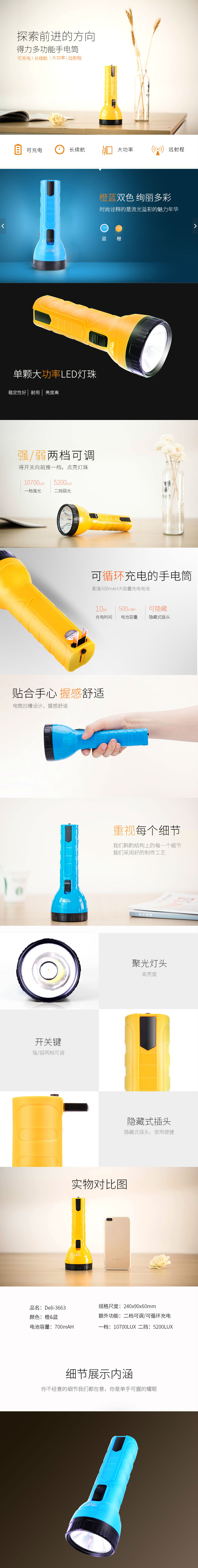 得力3663LED充电式手电筒(混)(只)24*9*6cm 500mAh