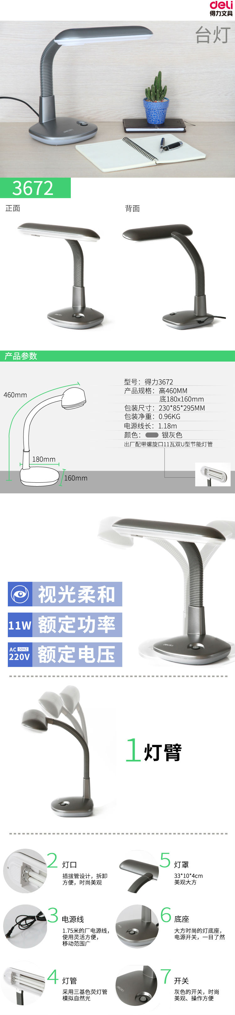 商品名称:得力3672台灯办公学习减蓝光护眼台灯节能3色可调节光线稳定