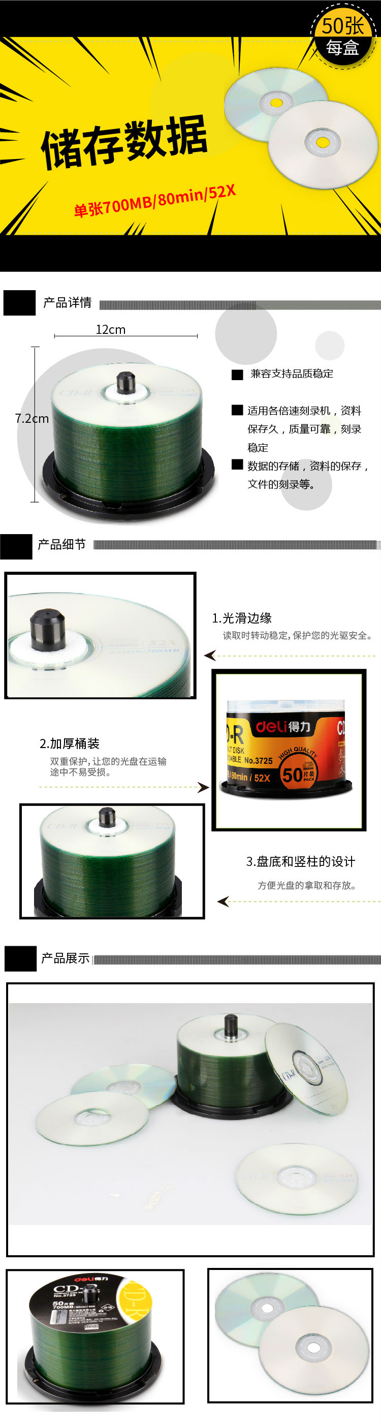 商品名称:得力3725塑盒装50片52X可记录式CD光盘CD刻录盘刻录光盘700M