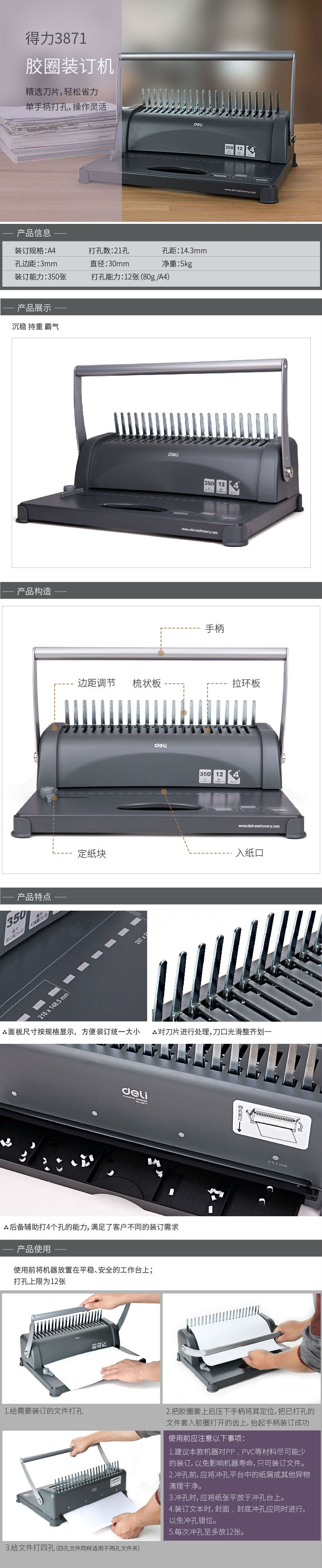 商品名称:得力3871装订机手动梳式胶圈夹条装订机A3A4纸打孔机胶圈发家