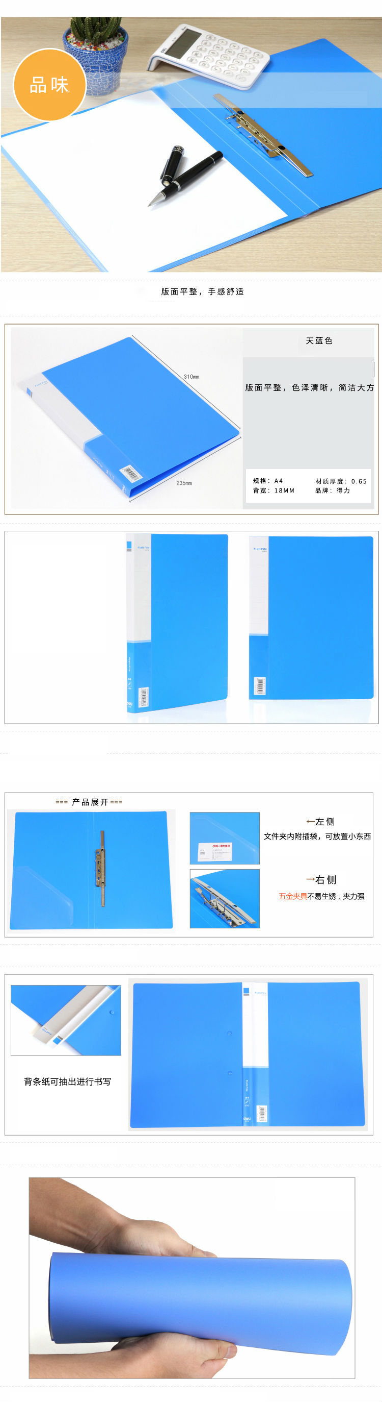 商品名称:得力文具5308活页资料夹A4单长押夹文件夹带插袋办公用品