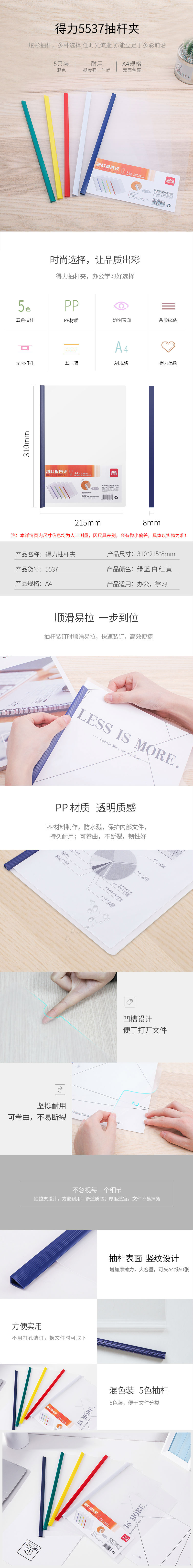 商品名称:得力5537透明文件夹抽杆夹A4混色装办公简历试卷书皮加厚夹