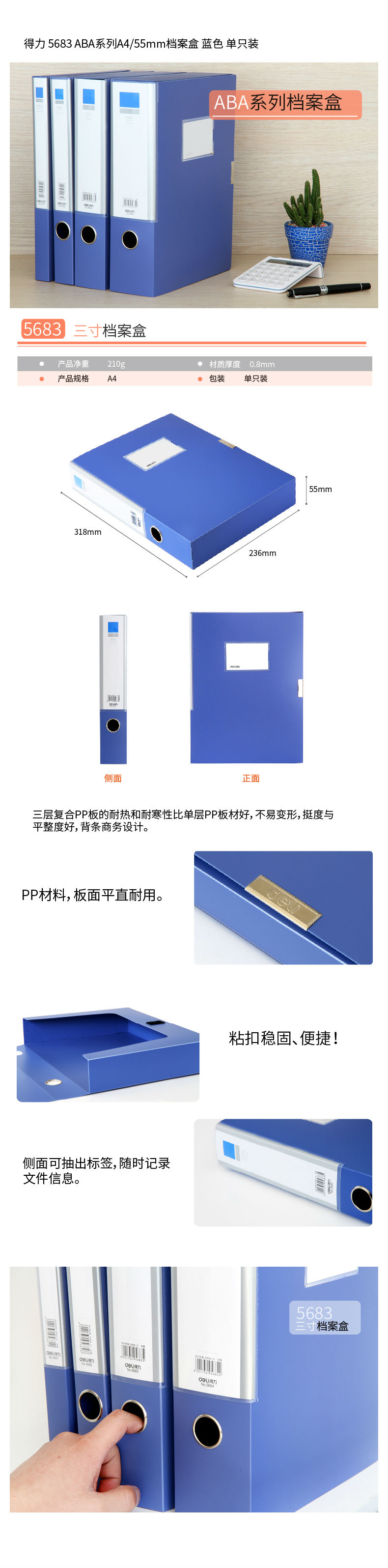 商品名称:得力5683档案盒A4档案盒塑料收纳文件盒a4资料盒55mm大号