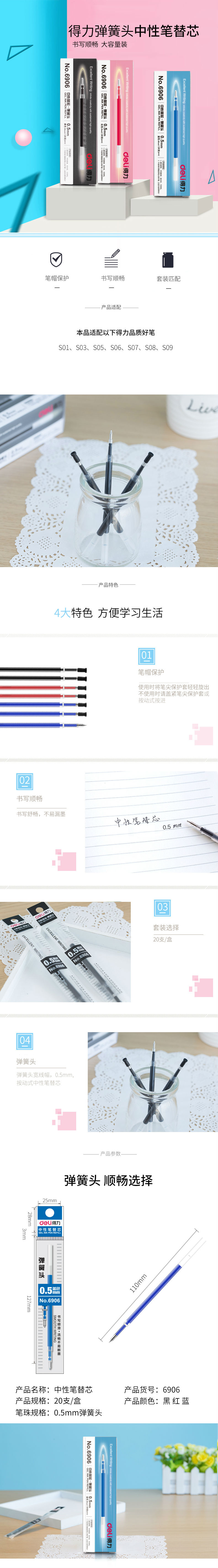商品名称:得力6906中性笔芯0.5mm弹簧头学生办公黑色签字笔