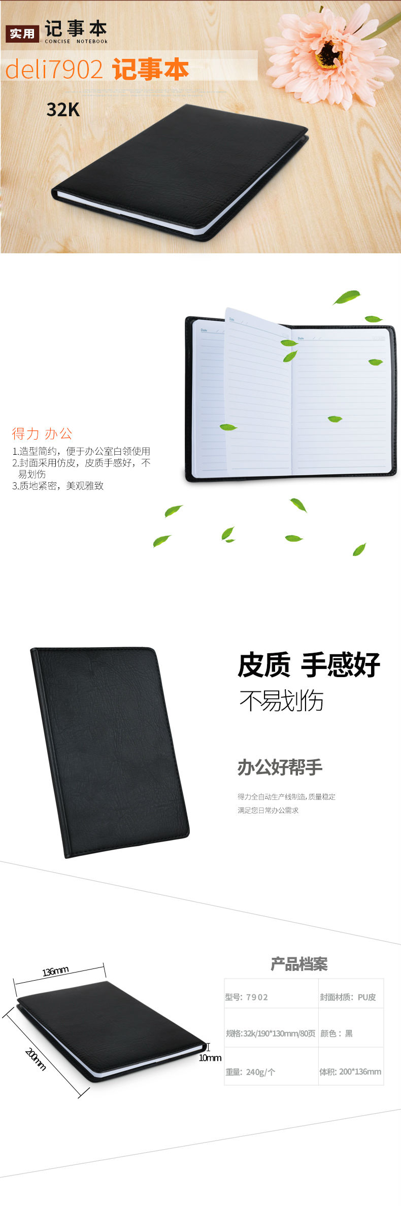 商品名称:得力7902皮面笔记本(黑)-80页-32K(本)
