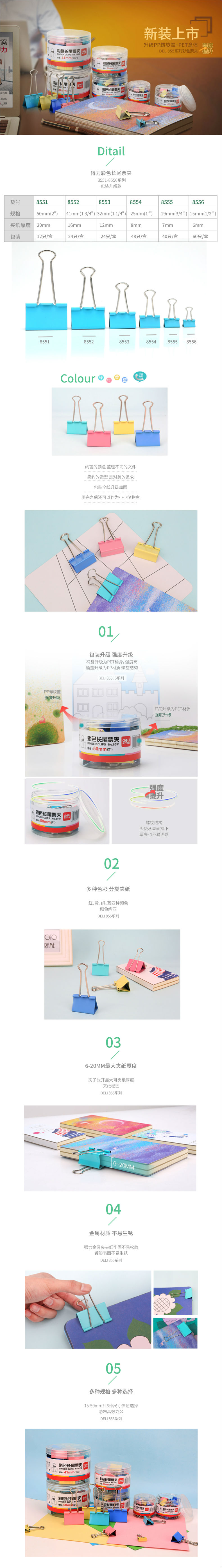 商品名称:得力8551-1#彩色长尾票夹51mm(筒装)(混)(12只/筒)
