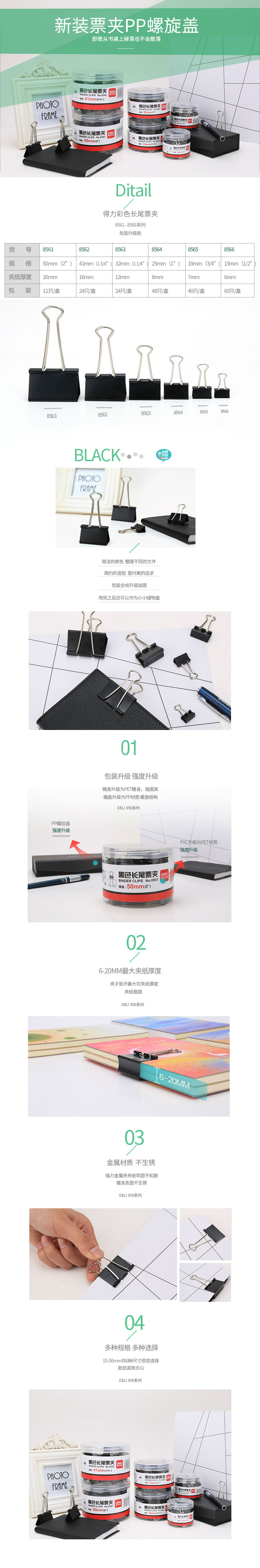 商品名称:得力8563-3#黑色长尾票夹32mm(筒装)(黑)(24只/筒)