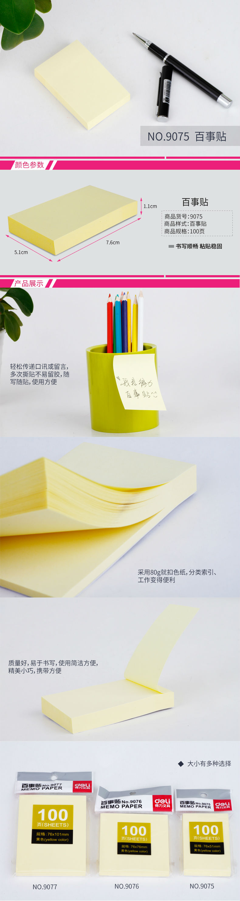 商品名称:得力9075百事贴(黄色)76*51mm(包)