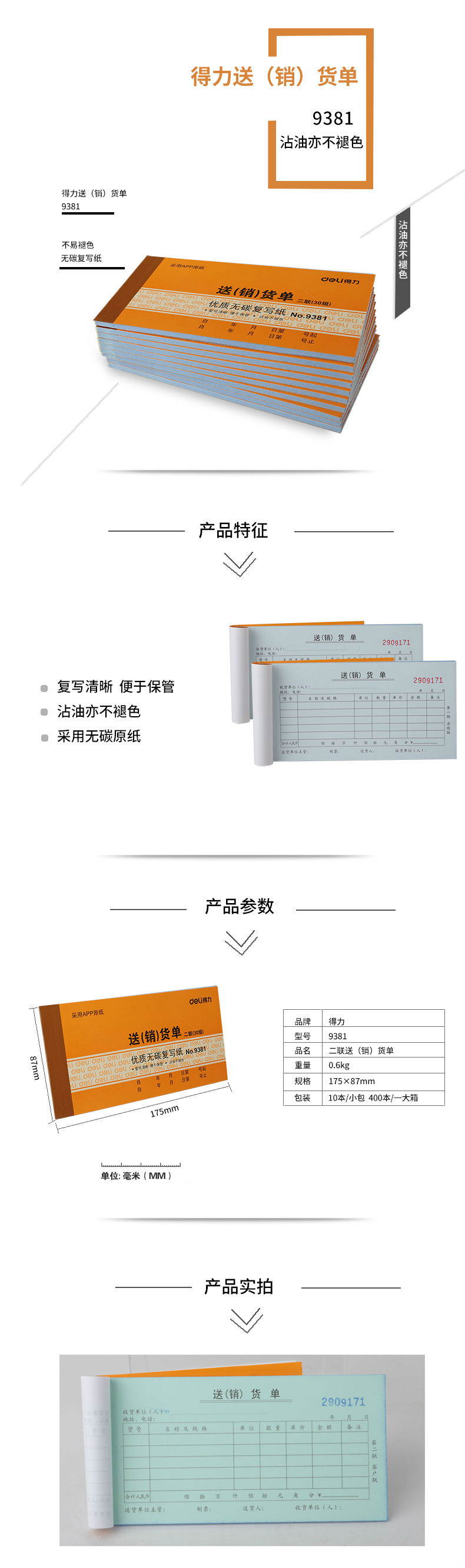 商品名称:得力9381二联送(销)货单(黄)87*175mm(本)