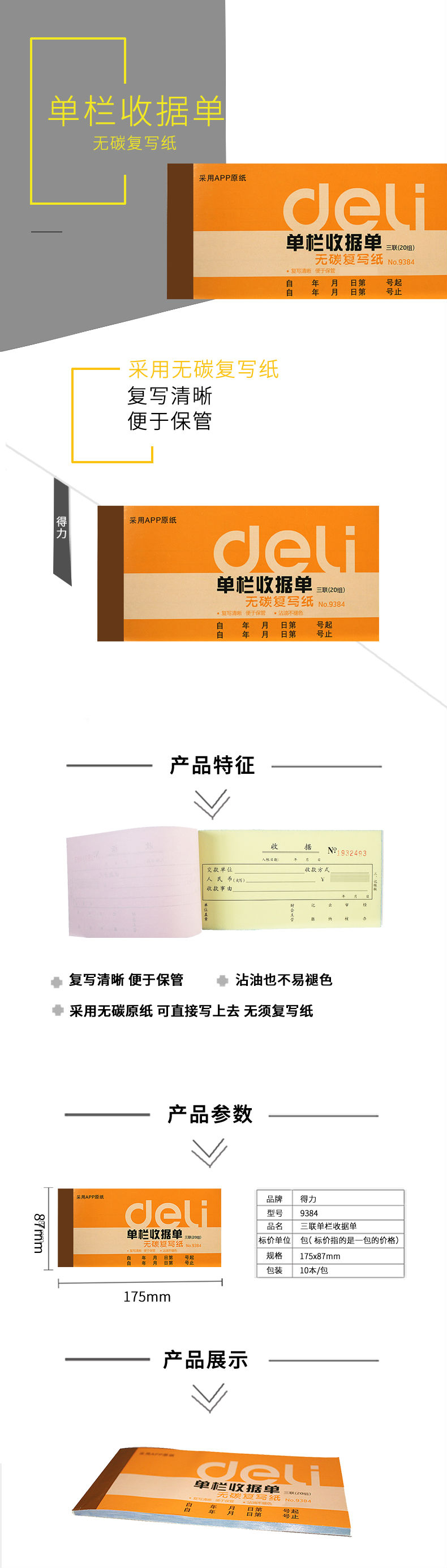 商品名称:得力9384三联单栏收据(黄)87*175mm(本)