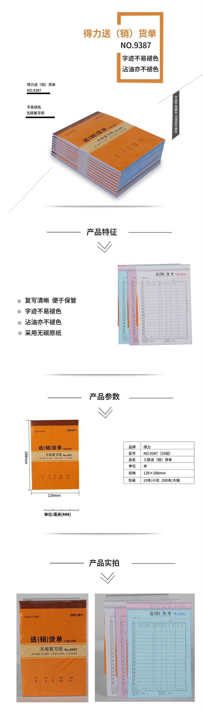 商品名称:得力9387三联送(销)货单据(黄)130*175mm(本)