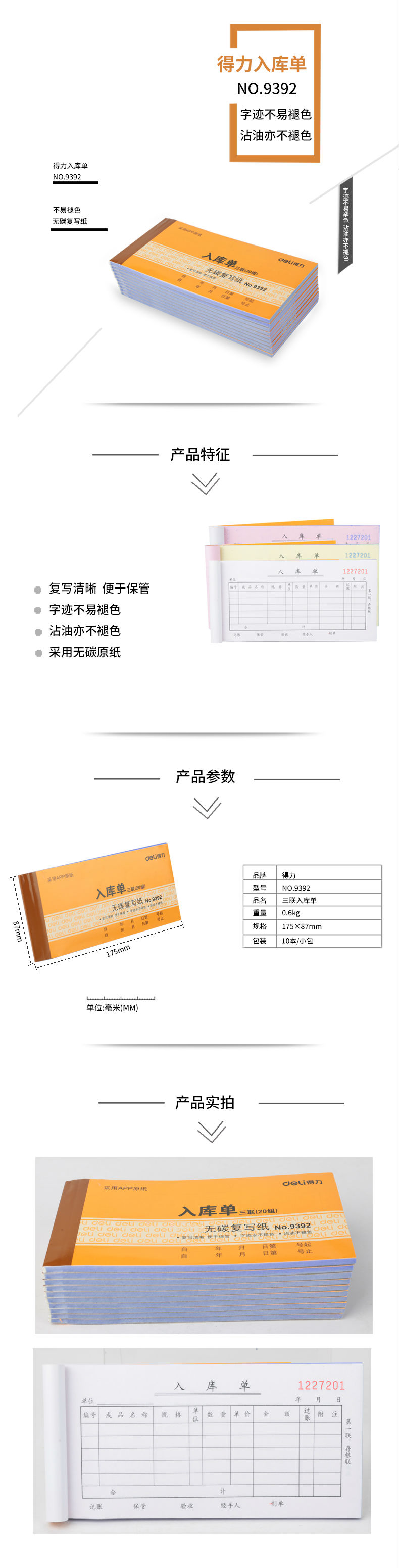 商品名称:得力9392三联入库单据(黄)87*175mm(本)