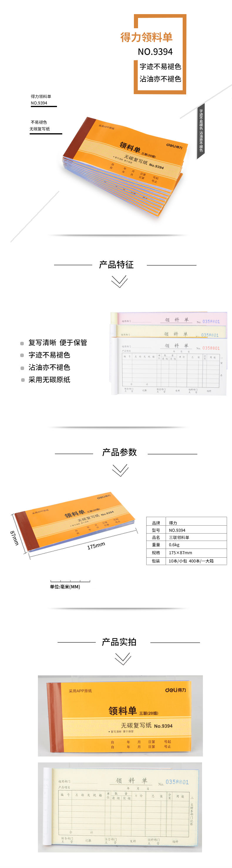 商品名称:得力9394三联领料单据(黄)87*175mm(本)