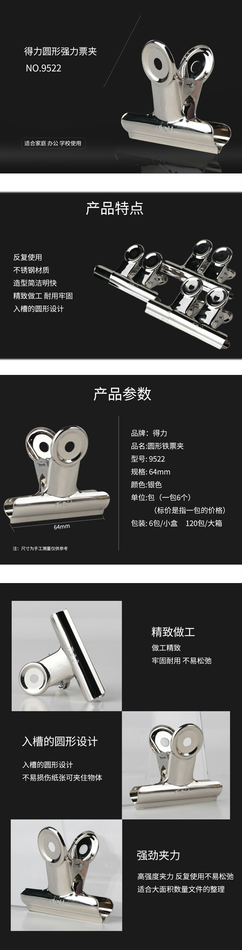 商品名称:得力9522-2﹟圆形铁票夹64mm袋装(6只/包)