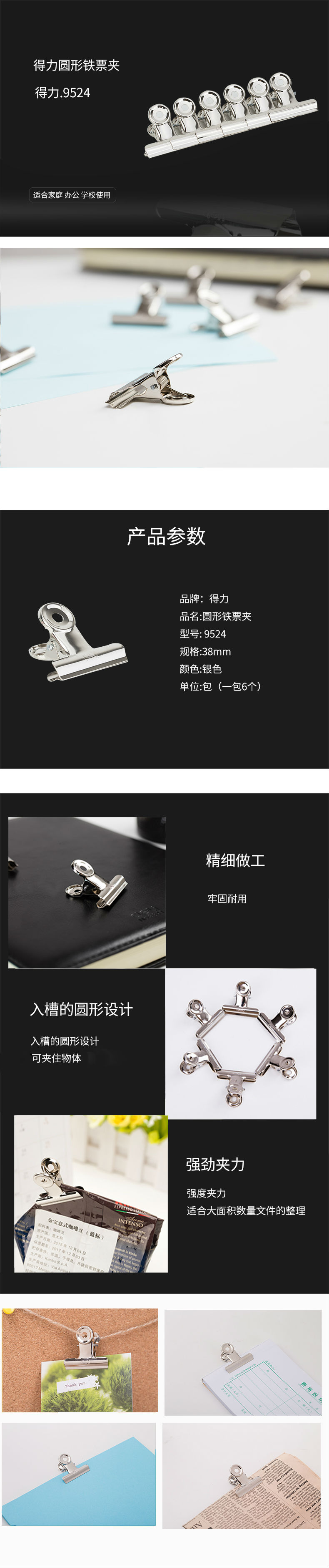 商品名称:得力9524-4﹟圆形铁票夹38mm袋装(6只/包)