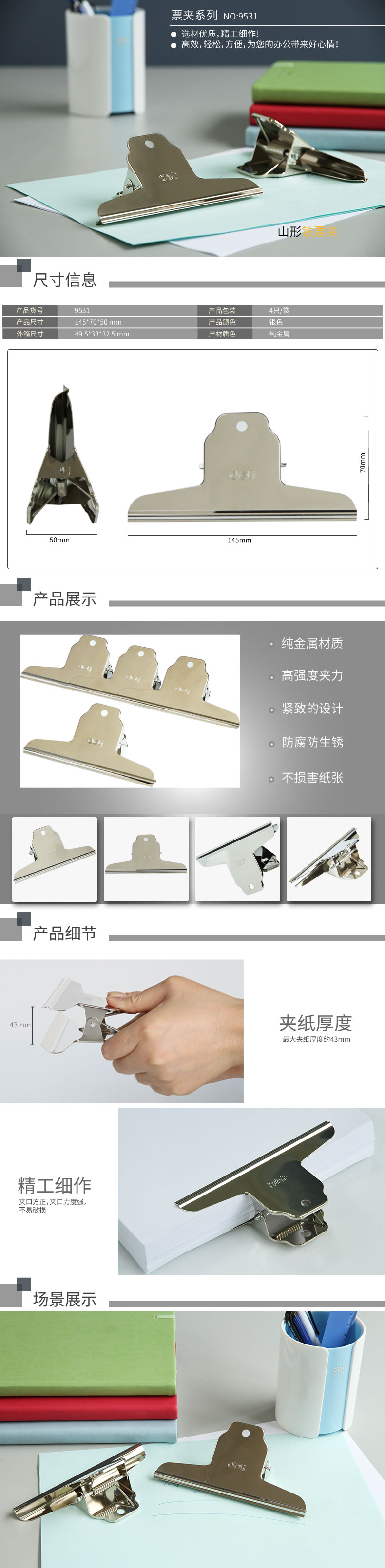 商品名称:得力9531-1﹟山形铁票夹145mm袋装(4只/包)