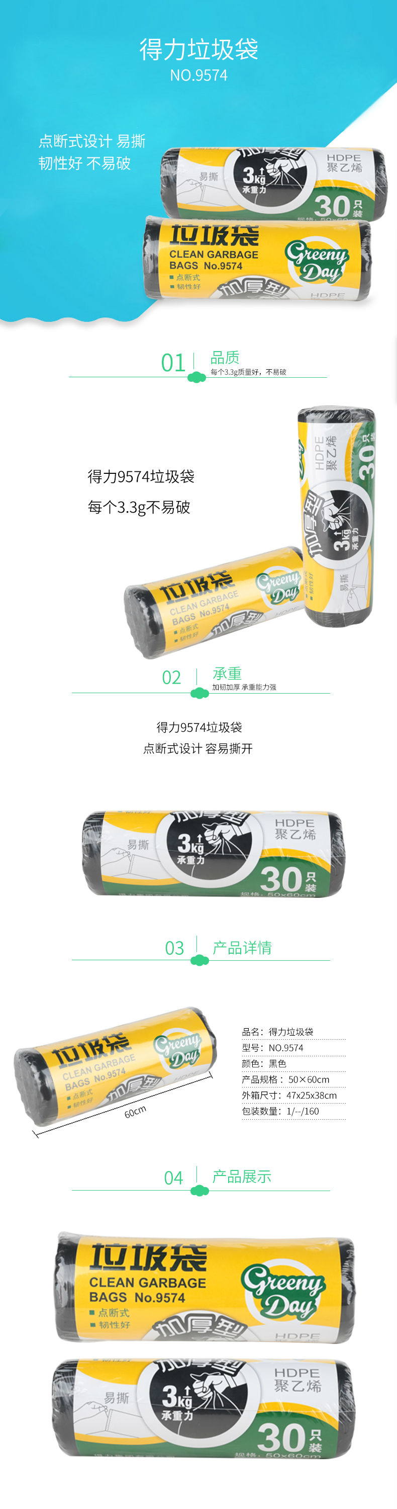 商品名称:得力9574垃圾袋(黑)50*59cm(30个/卷)八角底